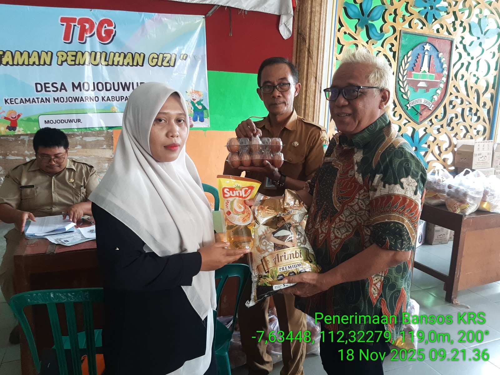 Selasa, 19 November 2025 - Dinas Ketahanan Pangan dan Perikanan Kabupaten Jombang menyalurkan bantuan sosial barang yang diberikan kepada keluarga resiko stunting (KRS) untuk 76 penerima bantuan dari Desa Mojoduwur, Kecamatan Mojowarno. Barang yang diberikan berupa beras 5kg, minyak goreng 2liter, gula 2kg, dan telur 2kg. Pemberian bantuan sosial barang kepada keluarga resiko stunting ini bertujuan untuk mencegah stunting secara dini, meningkatkan kualitas hidup, dan mendukung upaya percepatan penurunan stunting di Kabupaten Jombang.