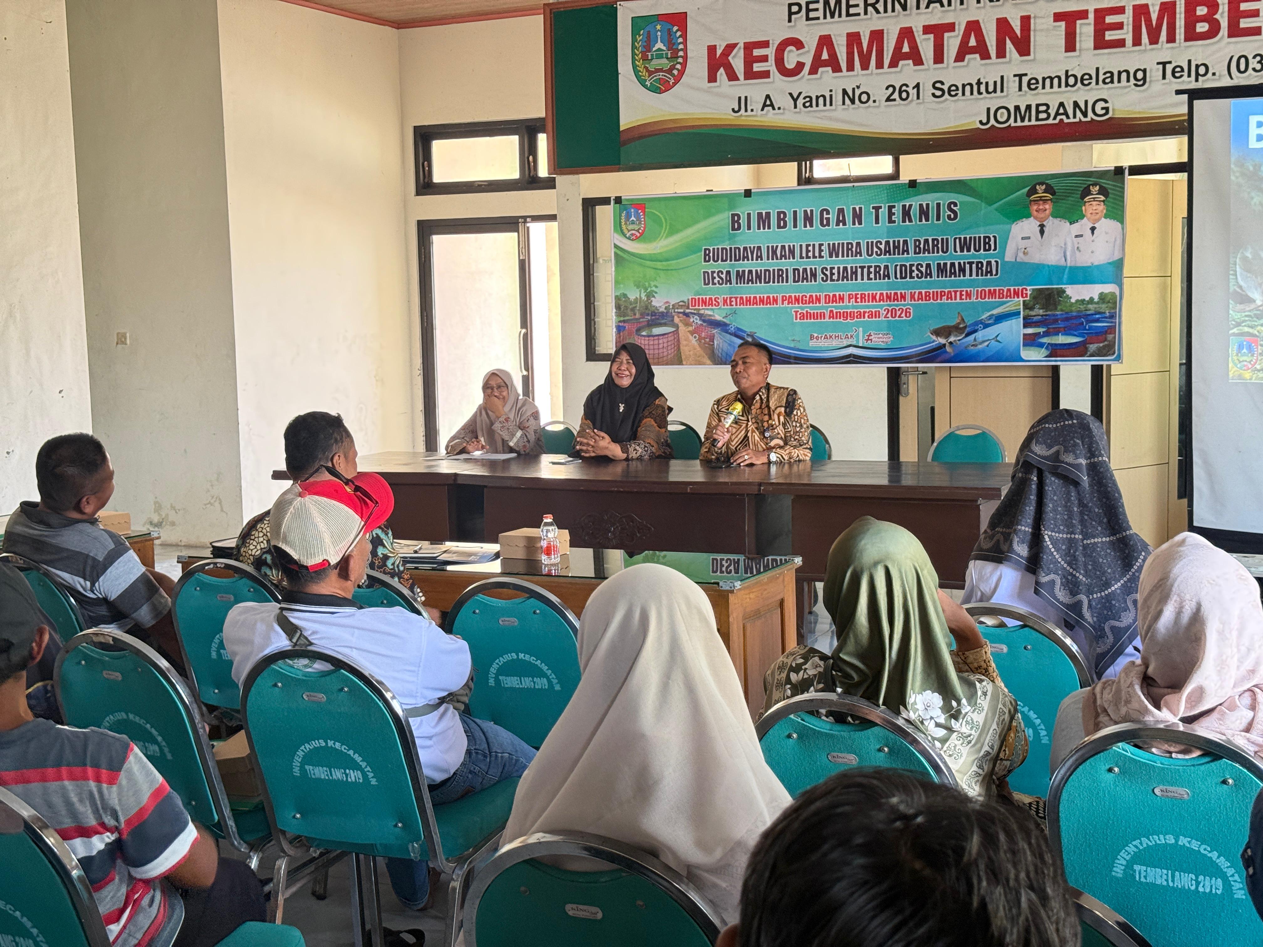 Kamis 23 April 2026, dalam rangka mendukung Visi Misi Bupati dan Wakil Bupati melalui program prioritas Desa Mandiri dan Sejahtera (Desa MANTRA) untuk menumbuhkan Wirausaha Baru (WUB) bidang Perikanan. Dinas Ketahanan Pangan dan Perikanan Kabupaten Jombang menyelenggarakan Bimbingan Teknis Budidaya Ikan Lele. Kegiatan berlangsung di Balai Desa Kalikejambon, Balai Desa Mojokrapak dan Kantor Kecamatan Tembelang.