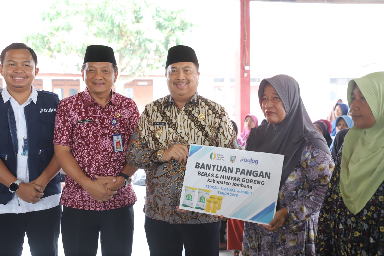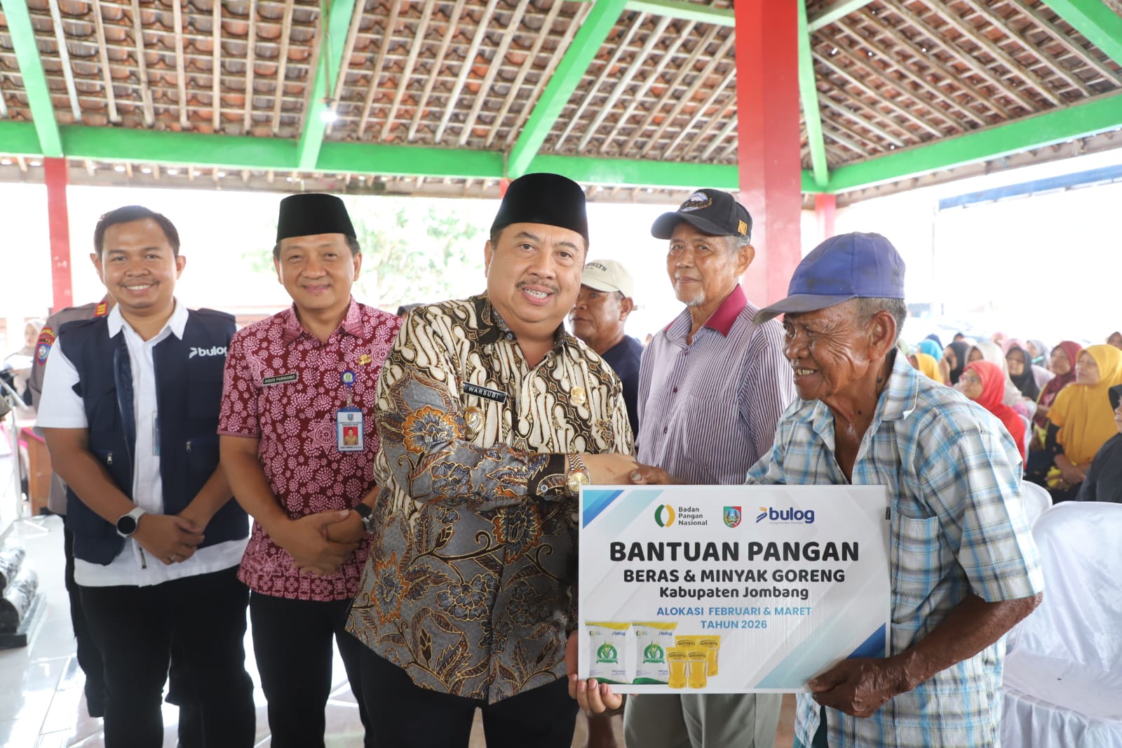 Setelah itu dilanjutkan Penyerahan secara Simbolis Bantuan Pangan Beras dan Minyak Goreng Alokasi Februari dan Maret Tahun 2026 oleh Bupati Jombang yang diberikan kepada 6 Penerima Bantuan Pangan. Masing-masing penerima mendapatkan bantuan pangan 20 Kilogram beras dan 4 Liter minyak goreng.
